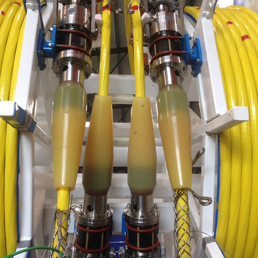 - Custom flying leads / umbilical terminated with single bore / MQC terminations on reels ready for shipment quayside.